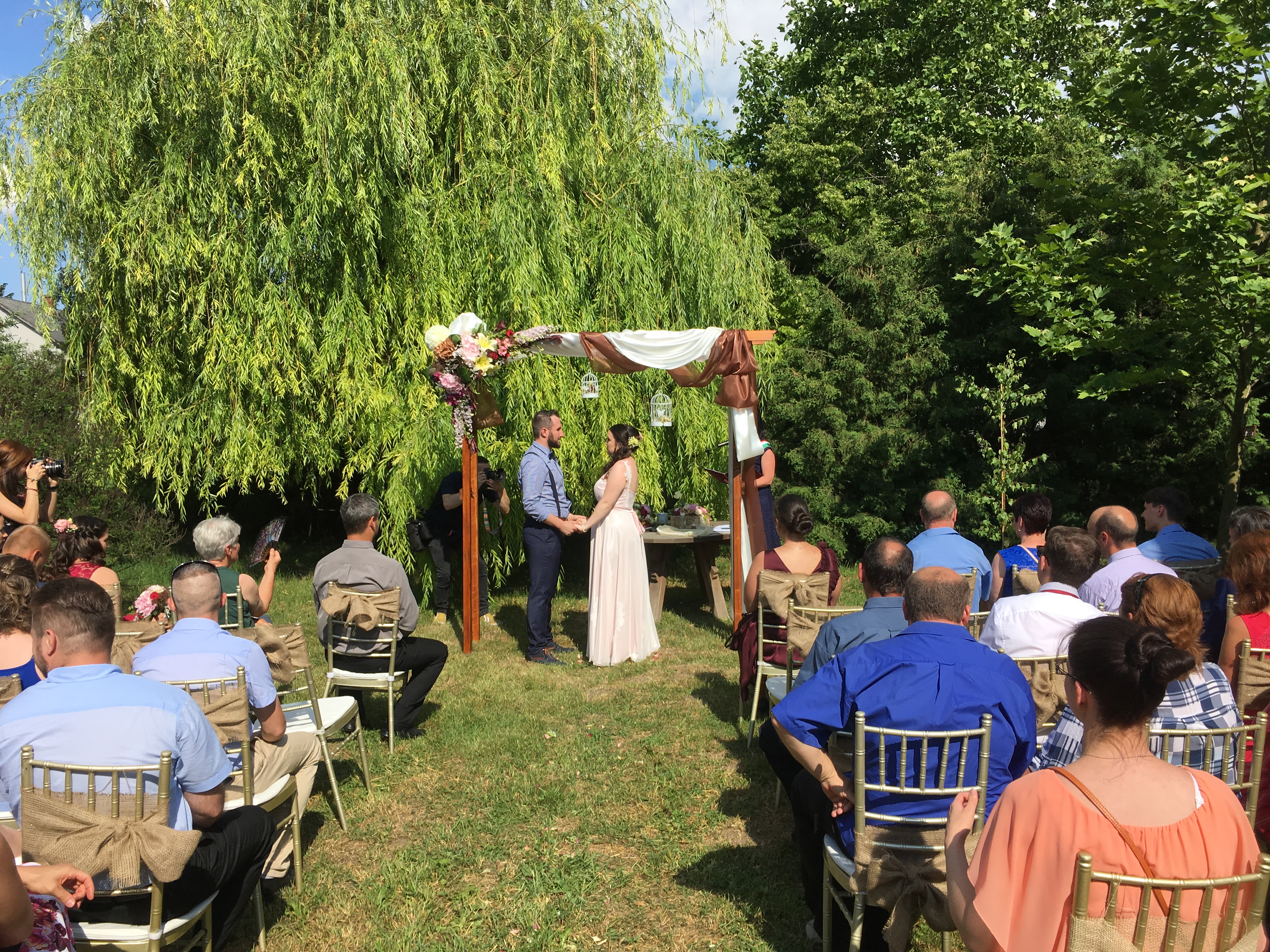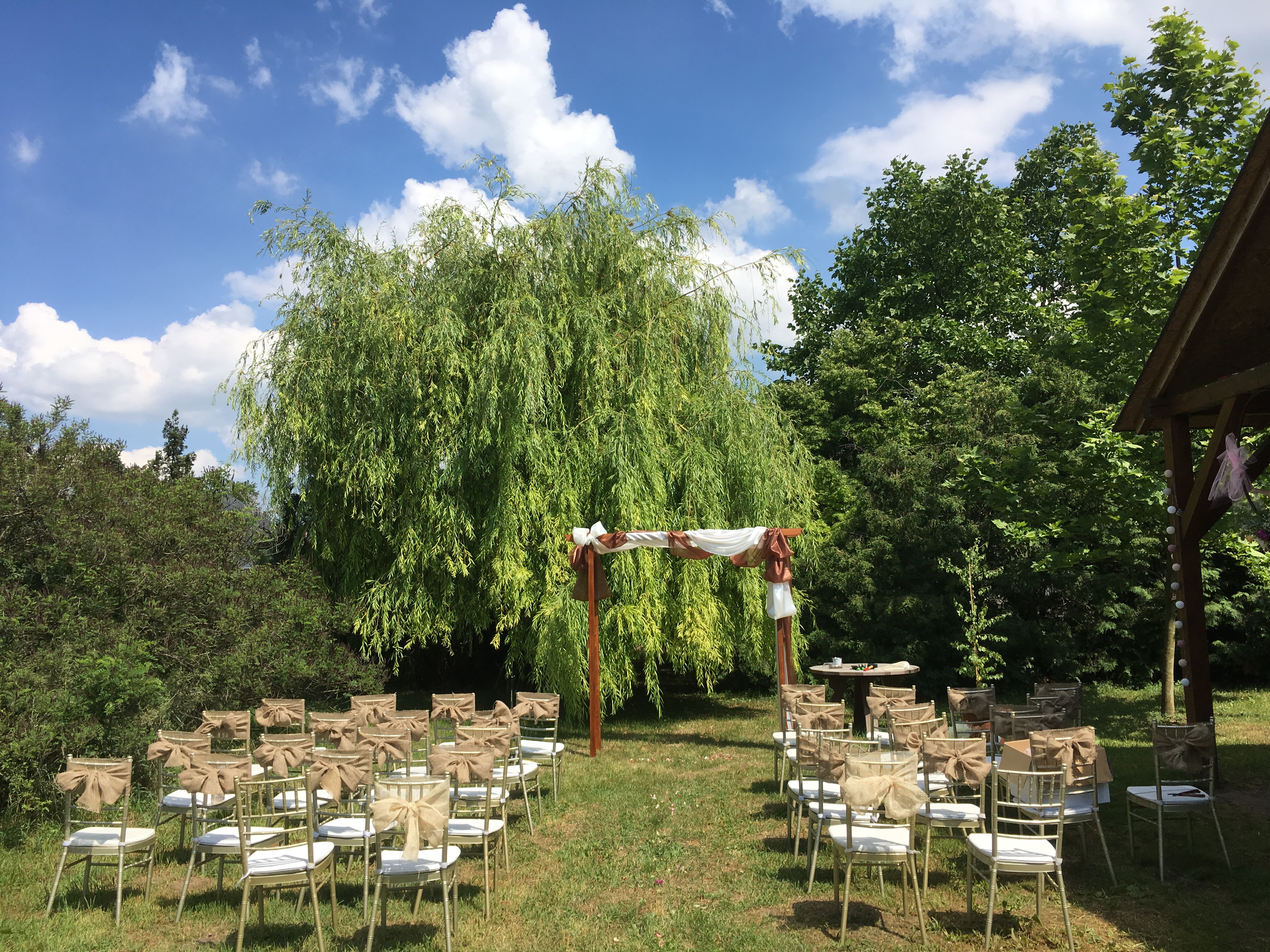 Esküvő Pusztaszabolcson a Boldogasszony közösségi Házban. Még nem esküvőztünk Fejér megye ezen részén, szerencsére könnyen elértük autóval Budapestről. 2018 májusában Helga és Lajos esküvőjére voltunk felkérve Esküvői DJ-nek. Meg voltunk bízva a polgári szertartás hangosításával és az azt követő esküvői party levezénylésével. Az esküvő helyszíne a Boldogasszony Ház volt, ami a templom mellett az Adonyi út 46 szám alatt található. A polgári esküvő a Boldogasszony Ház hátsó kertjében volt, ahol minden vendég számára arany színű chiavari szék biztosította az ülőhelyeket. Az esküvő stílusa a vintage volt. Ez remekül megjelent a dekor elemekben fa, raklapok, csipkék, befőttes üvegek csak, hogy néhányat említsünk a vintage esküvő alap kellékei közül. Az időjárás is mellettünk volt, hiszen csodás napsütéses idő volt, kék égbolttal.