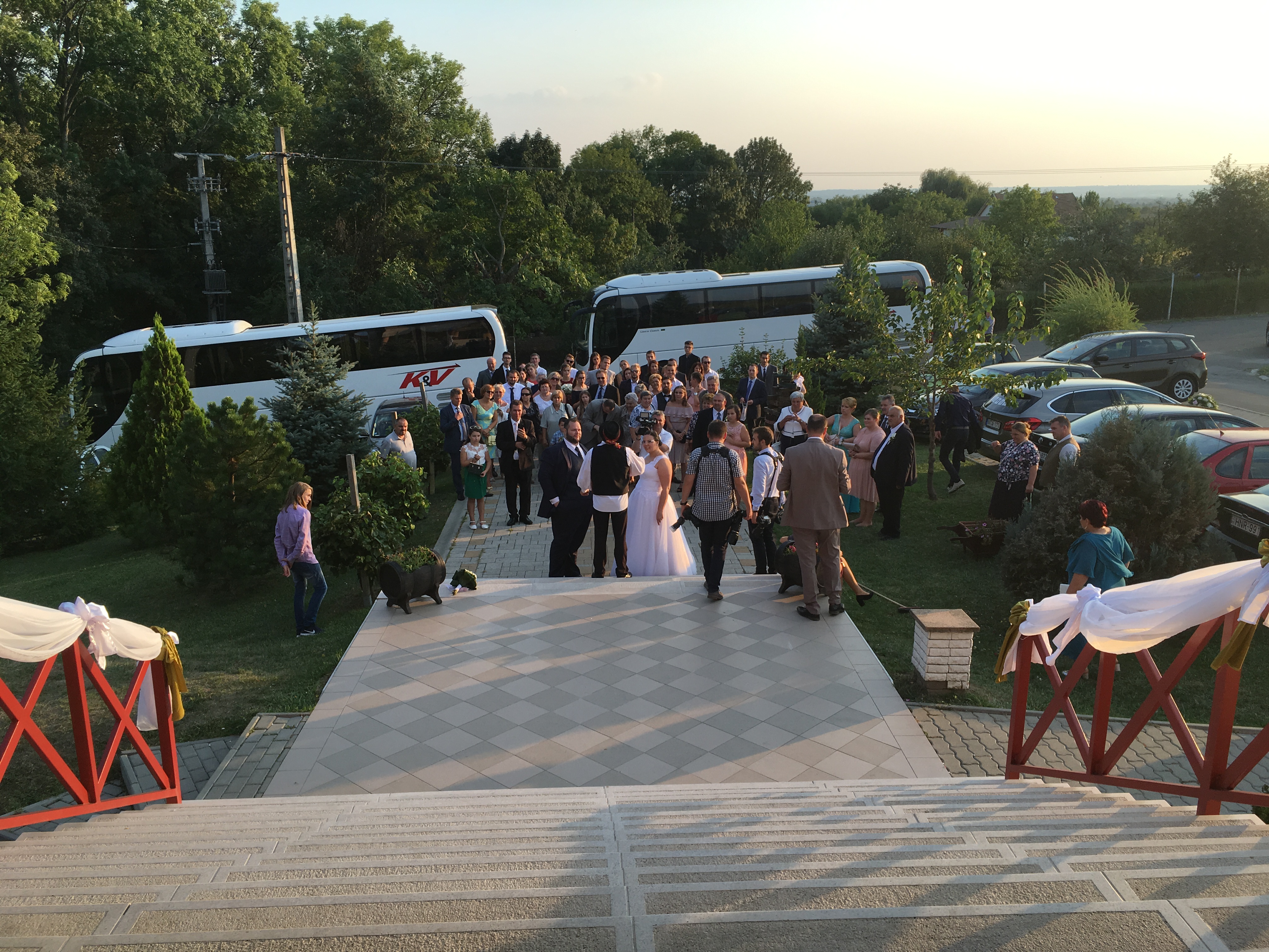 Polgári szertartás ezúttal nem volt a helyszínen, csak hagyományosnak mondható lánykikérés, mondókák és bemenetel előtt tányértörés. Az érkezés után sok-sok aprósütemény és hideg italok csillapították az erre csábulók igényét. Az esküvői vacsora a teljesen hagyományosnak mondható újházi tyúkhúsleves és a nagy klasszikus sültes tál volt, bőséges adagokkal. A násznép egy része bent, míg a másik fele a Sziluett Borhotel teraszán ült kint. A nyitótánc után egyből a bulival indultunk, a buli első felében nosztalgia, retro zenéket játszottunk, rock'n roll örökzöldekkel, hogy minden generáció megtalálja a számításait. Az esküvői dj buli reggel 4-ig tartott, utólag a pár elmondta, hogy a násznépben volt több esküvői zenekar tag, így ők figyelték a munkánk egész este. A buli végeztével ők is azt mondták, hogy nagyon jól végezzük a dolgunk, és jól érezték ők is magukat. A Sziluett Borhotel Farkasmályon található a Pincesor elején. A nap folyamán láttuk, hogy itt parkolt le több nagy busz, amik hozzák a turistákat a Pincesorra bortúrára. Ajánljuk a helyszínt, jól vizsgáztak a felszolgálók és az esküvői menü is. Egy klassz helyszín esküvői csomagajánlatokkal esküvő a Mátrában. Esküvői DJ Gyöngyös.